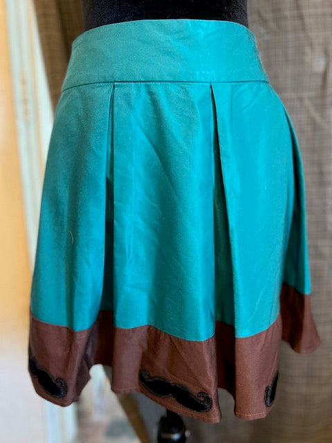Power up your style with this one-of-a-kind Handlebars pleated skirt! Upcycled and featuring mustache patches, this green and brown beauty is sure to turn heads! Go ahead, handlebar your way to fashion success!
