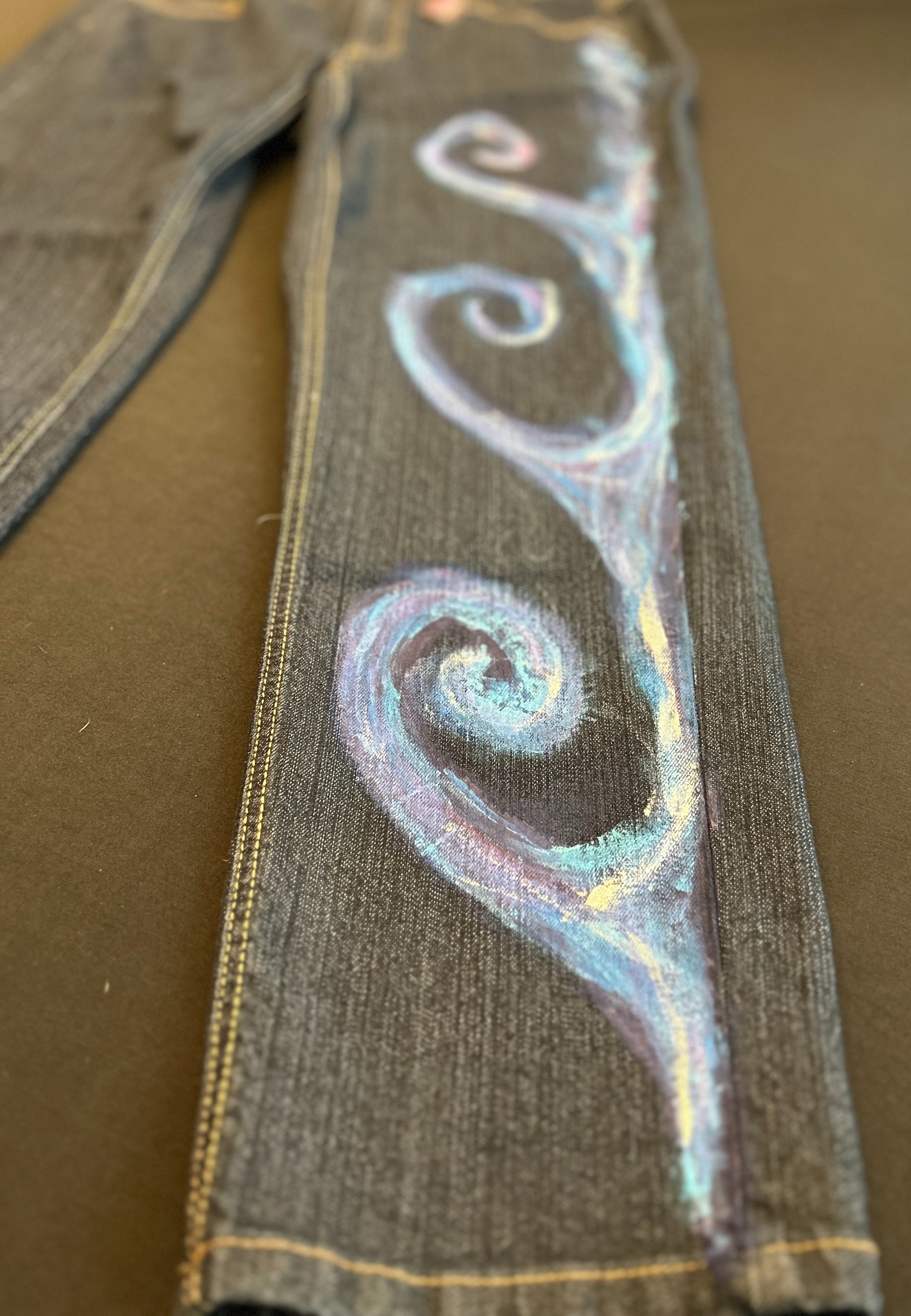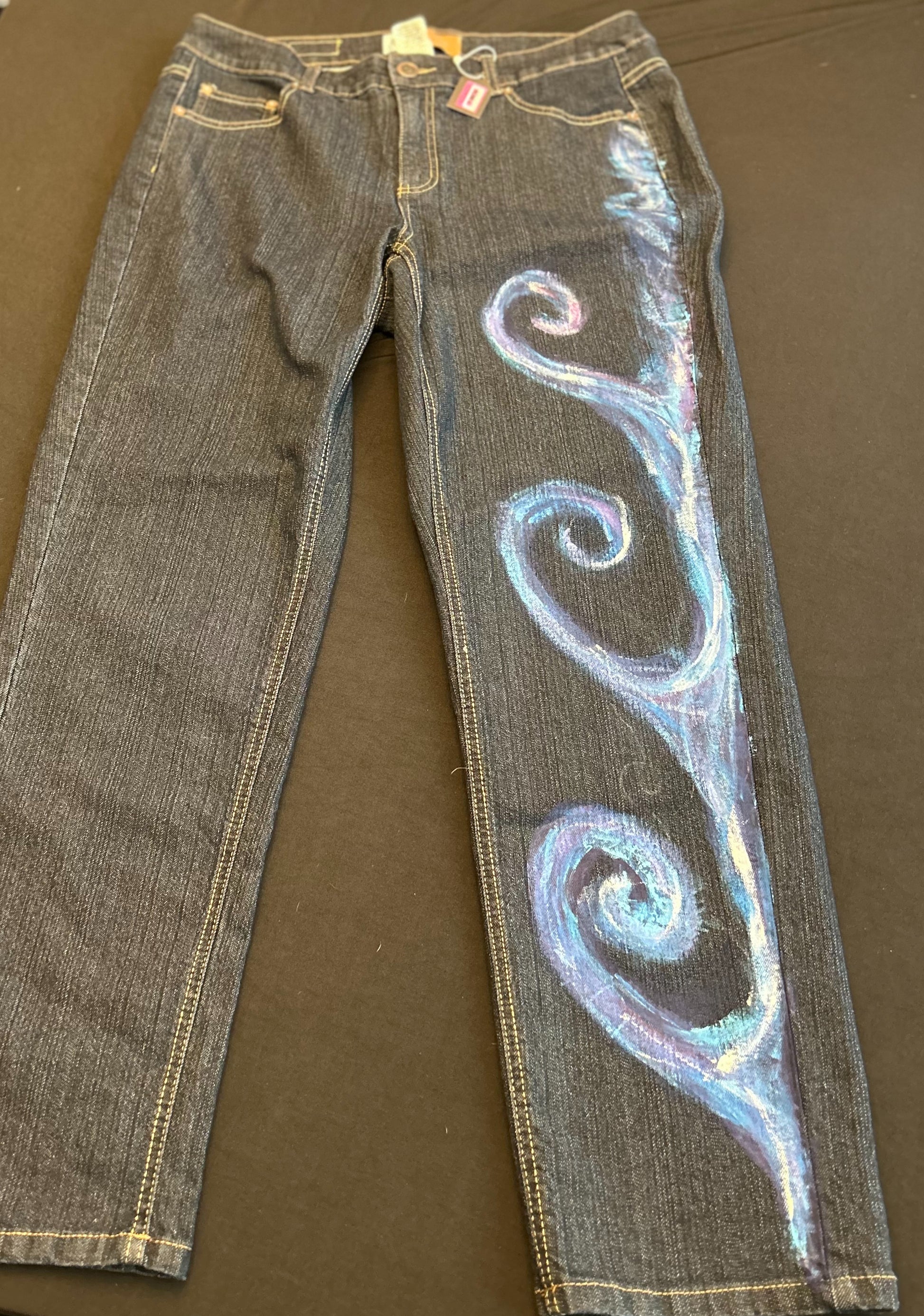Let your style make waves with these unique, upcycled jeans. Hand-painted waves create an eye-catching design on the dark wash, and you'll be stoked about the sustainable style! Show off your one-of-a-kind look with these totally rad jeans. Surf's up!